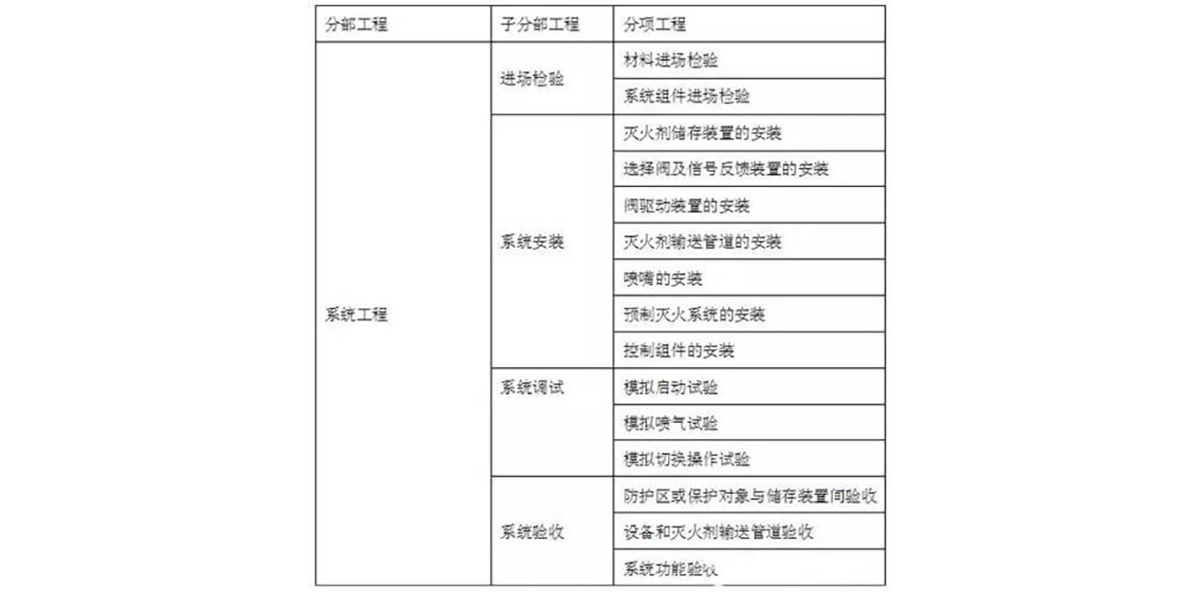 气体灭火系统的分部工程、了分部工程、分项工程划分可按下本规范表执行