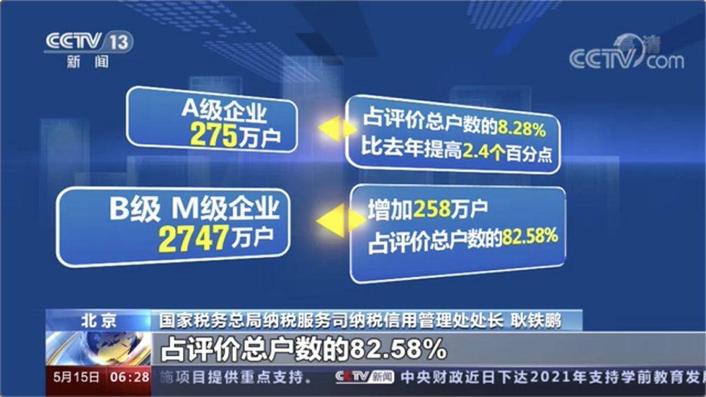 2021年全国纳税信用评价中A级企业275万户,占评价总户数的8.28%。
