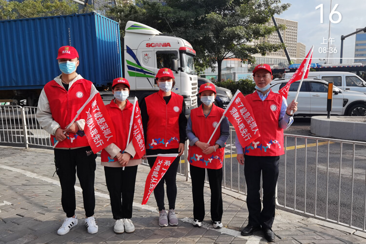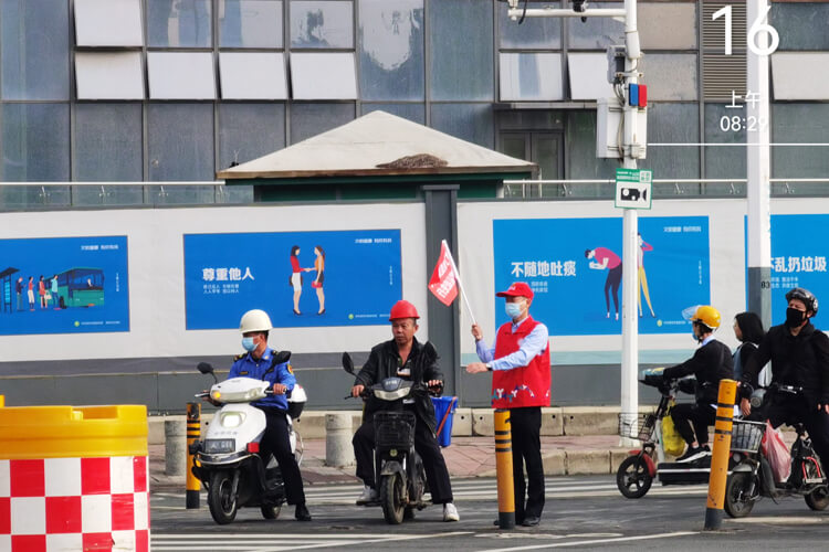 12月16日清晨,由广东昊安党支部李小辉同志领队,带领党支部成员们在李朗国际珠宝园红绿灯路口做交通指引、骑行提醒服务。